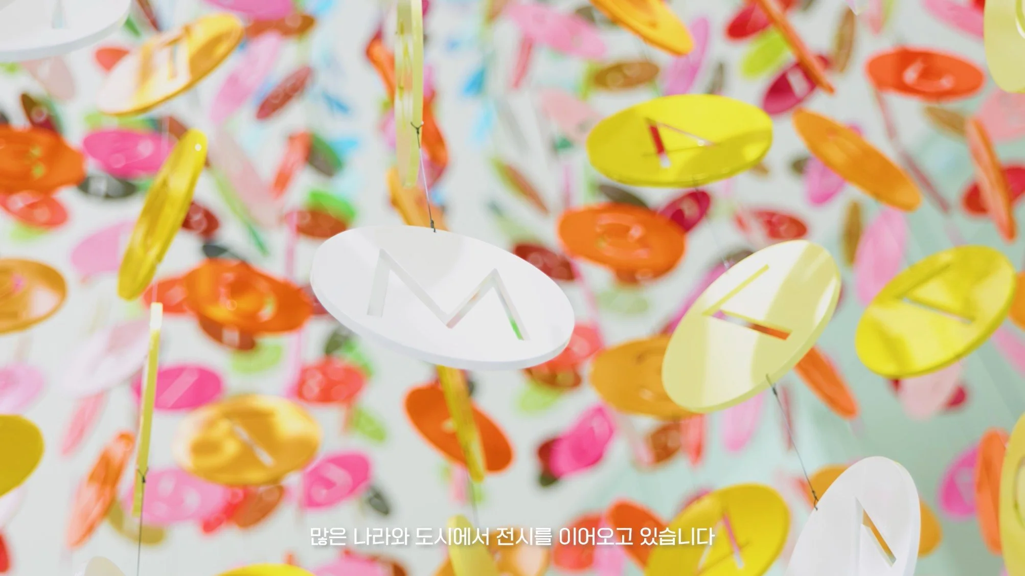 Located on the main street of the Gangnam district in Seoul, the building has been newly constructed for the showroom. The interior space has been designed in a white color scheme, reminiscent of a gallery. The over 5 meters high colorful installation, composed of 2,300 circular modules regularly aligned on a three-dimensional grid, floats in the middle of the three-story atrium space. The 12 cm diameter acrylic circles are painted in 100 shades of colors, each module shining in the sunlight entering the room. Inside each circular module, there are cutout numbers from 0 to 9. The orderly arrangement of countless colors and numbers represents the infinite possibilities of color.