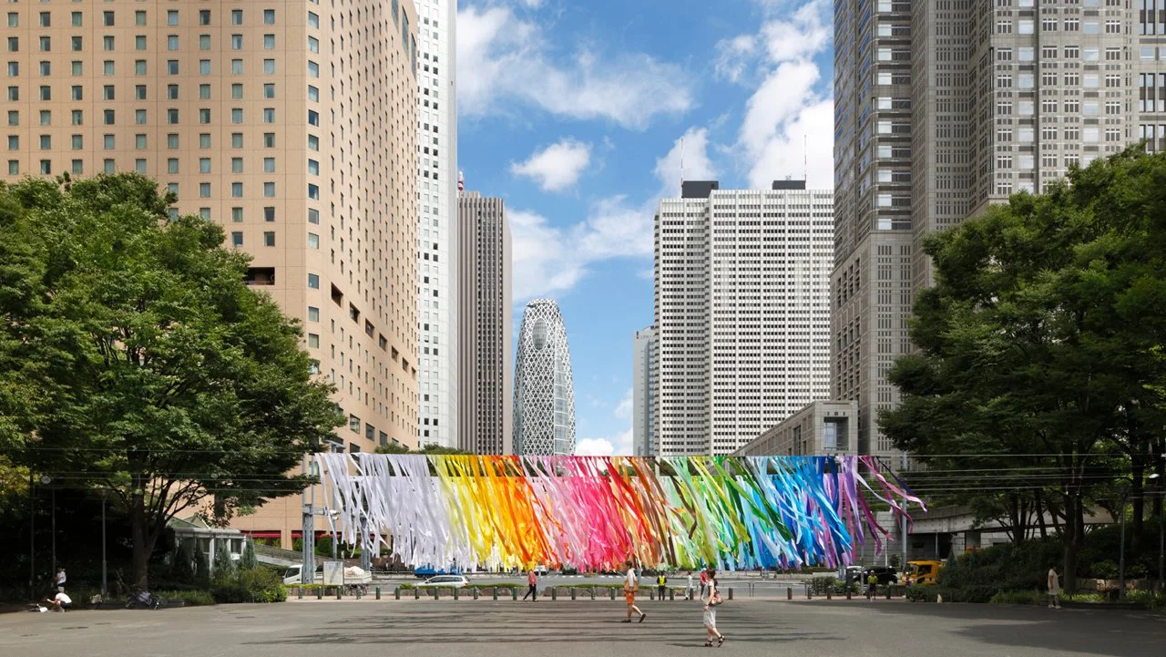 In 2013, the first '100 colors' installed specially selected papers to create a floating volume of colors. For this year, textile was chosen as a medium to catch the breeze seaming through the skyscrapers of Shinjuku. The dye compounds were carefully blended to create the unique 100 colors formula, and 1875 strands of textile were hand-dyed one by one. 100 colors are floating and swaying in the wind, coloring the breeze travelling in the city, casting gentle shadows in the summer days of Tokyo. Colors are layered with the high rise buildings, creating an extraordinary scene, attracting eyes of people walking by. Floating colors in the sky of Shinjuku is a breathtaking installation that has given people a little moment to stop by, away from the busy reality.