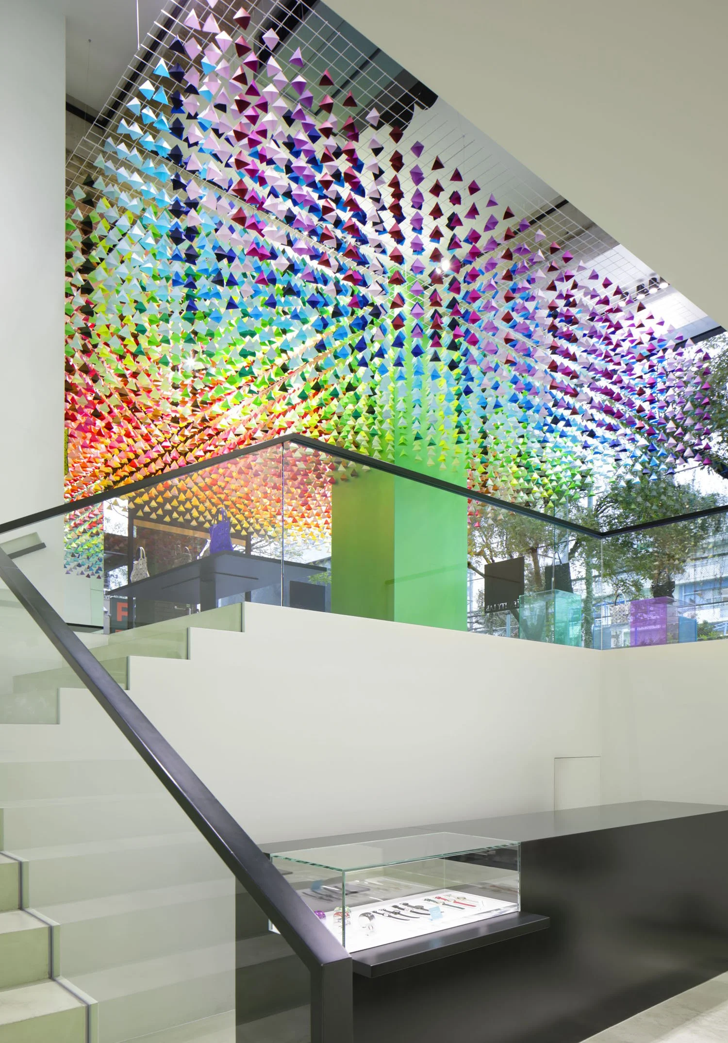 Thin and long colorful threads, representing strands of merino yarn are made into three dimensional volumes that intersect inside the windows with mannequins positioned in between. The installation has started at Ginza flagship store, on the facade and the glass case. Inside the store, the main glass case uses 2,420 threads in 60 shades of colors to create volumes, radiating from the floor to the ceiling. The long thin lines cross and intersect three dimensionally, and the expressions of layered threads change as the view keep shifting. On the facade is a graphic interpretation of the thin merino yarn layered with white graphic lines on the front glass, intended to give depth to the window.