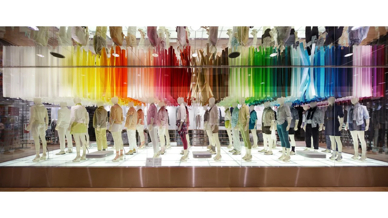 The paper strands in 100 shades of colors are floating and swaying above the mannequins, giving the feel of standing in the spring breeze. The gentle swaying motion of the floating volume of colors is expressing the beginning of new season on the colorful wind.