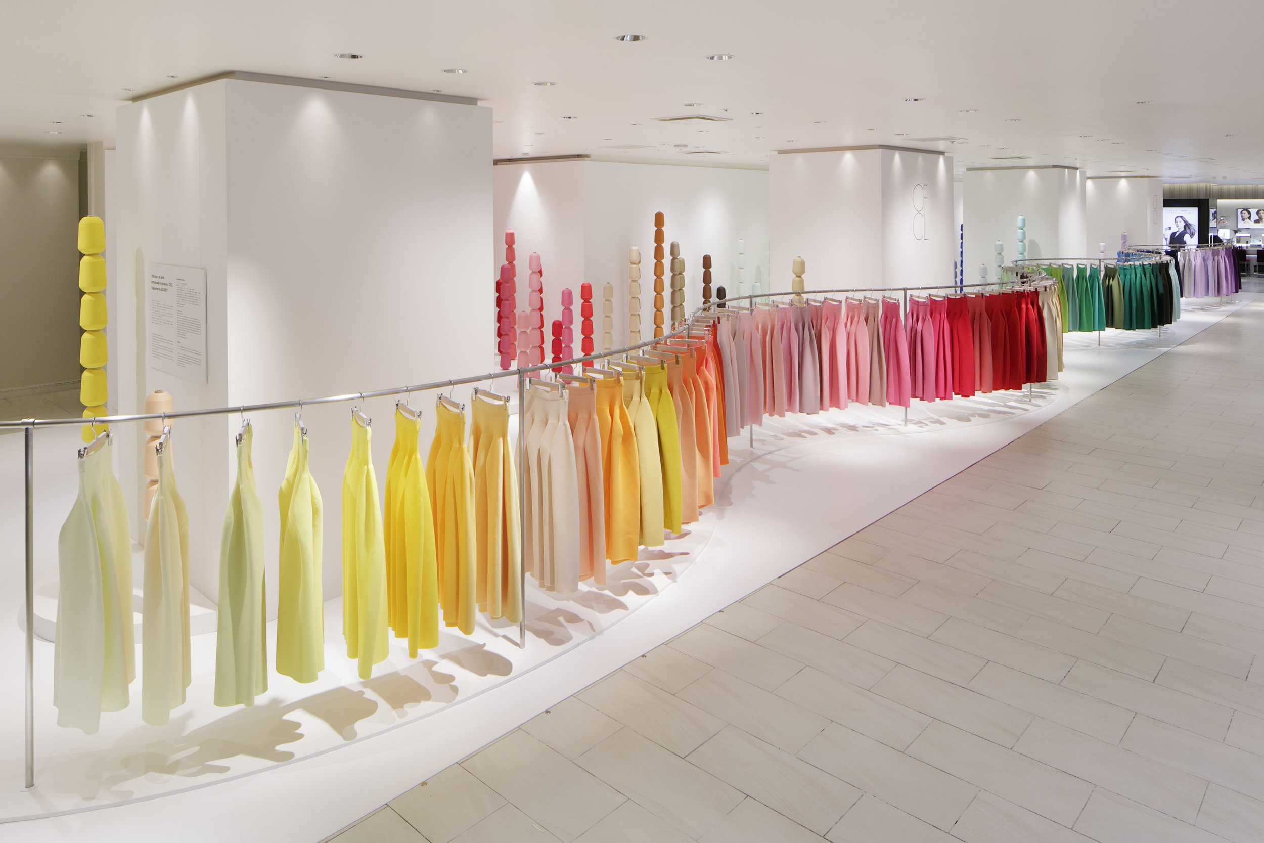 Pop-up events were held in Tokyo from July to August 2024, and in Seoul, Korea in November. On display are 100 Pottery Skirts made from 100 colors selected by Emmanuelle. The 100 colors were carefully selected by Emmanuelle from a wide range of colors of Teijin Frontier's recycled polyester yarn ECOPET®, a fiber professional, and knitted one by one on the WHOLEGARMENT machine at CFCL Knitting Lab. A hanger rack was also designed to display the 100 garments in the space in a single line.