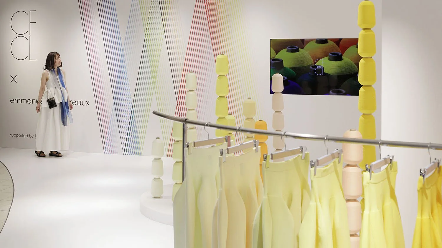 CFCL, known for its unique knitting techniques to create unique fashion items, and Emmanuelle’s “100 colors” collaborated to bring CFCL's signature item, the “POTTERY SKIRT” to the event in 100 different color variations.